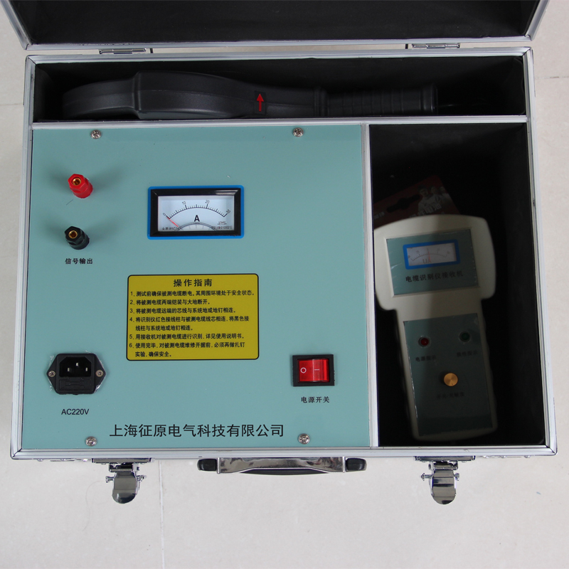 本儀器由電纜識別發(fā)射機,電纜識別接收機、發(fā)射卡鉗和接收卡鉗及輸出信號連接線組成。它具有大功率電流脈沖輸出;現(xiàn)場接收信號特征清晰,輕便靈活,靈敏度高,能有效抑制現(xiàn)場工頻干擾;判斷準確、快速;保護電路可靠,不怕輸出短路;大鉗口ф125適合各種截面積的動力電纜;內(nèi)部具有大功率隔離變壓器,操作者與市電不存在任何電氣上的直接接觸。極大的保證了人身安全。帶電電纜識別時不需要斷開各電纜兩端與變配電設(shè)備間的連接,可在電纜處于帶電的狀態(tài)下進行在線識別,提高了識別的效率,大大減少了由于停電所造成的直接和間接的經(jīng)濟損失。